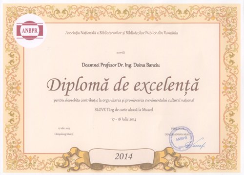 Mrs. Prof. Dr. Eng. Doina Banciu - General Director of the National Institute for Research - Development in Informatics - ICI Bucharest received the Diploma of Excellence from Romania's National Association of Librarians and Public Libraries for her outstanding contribution to the organization and promotion of the national cultural event.